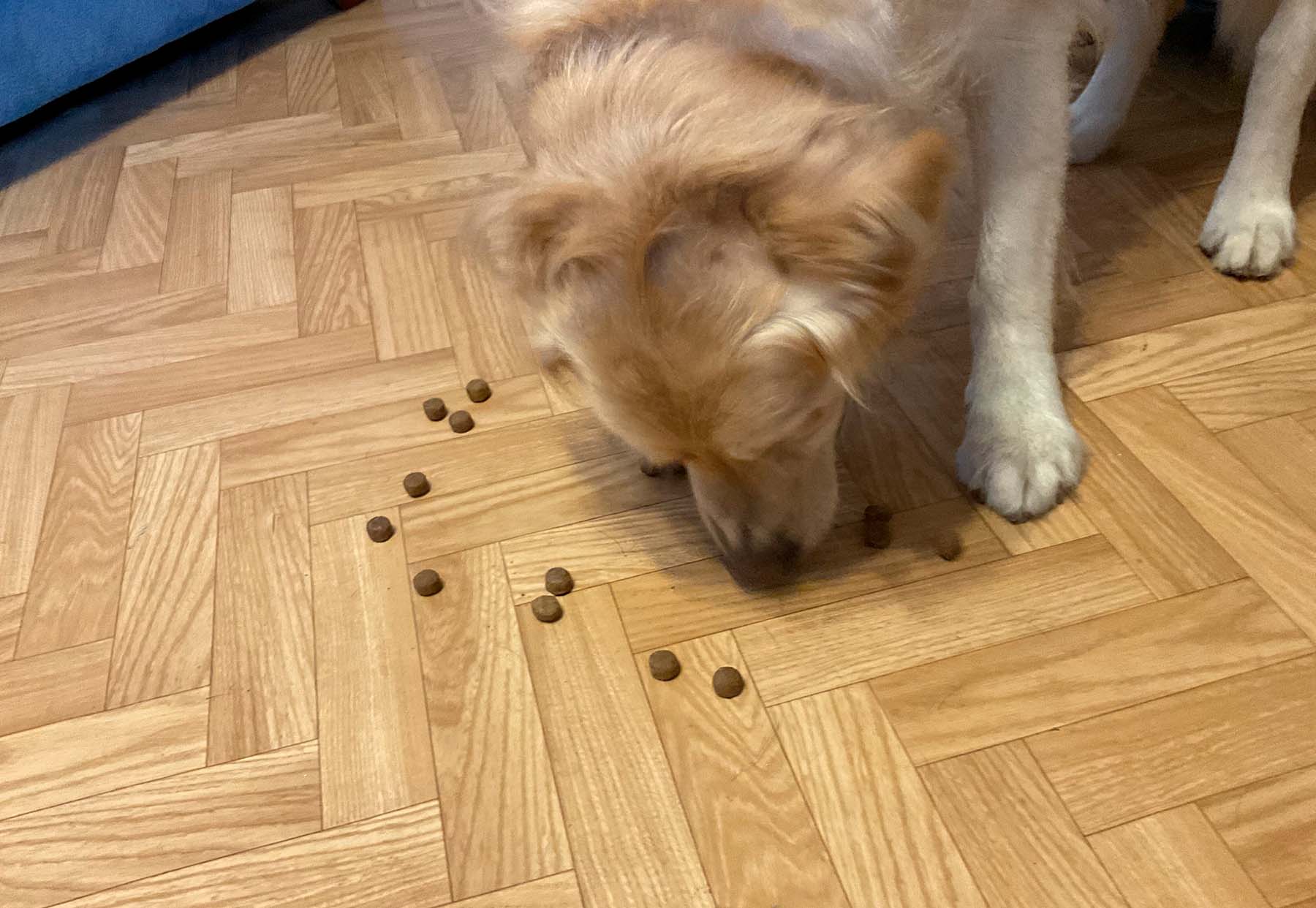 Si por mí fuera siempre estaría comiendo, soy un glotón y me gusta todo, pero mi dueña normalmente me das unas bolitas que saben bastante bien. Después de comérmelas lo olisqueo todo para ver si hay alguna bolita más y luego me espero hasta que ella se sienta a comer, pongo cara de bueno, y la miro fijamente para que me dé algo de su comida ya que sabe muy bien. No siempre me da algo, pero el día que sí me pongo muy contento.